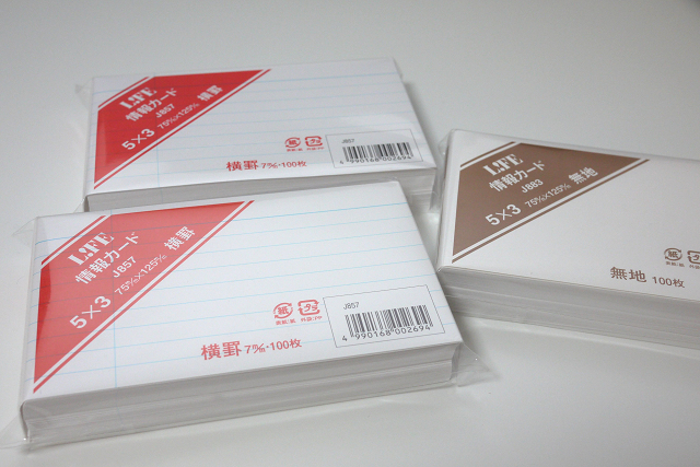 ノートなども使って記録しますが、情報カードのいい所はサッと取り出せてすぐに書き込めるスピードの早さ。100円ショップによくあるメモ帳(A7サイズ)などもすぐに書き込むには良いツールなんですが、あれだとサイズが小さいのです。まあ、この辺りは完全に好みなので、メモ帳を否定しているわけではありません。