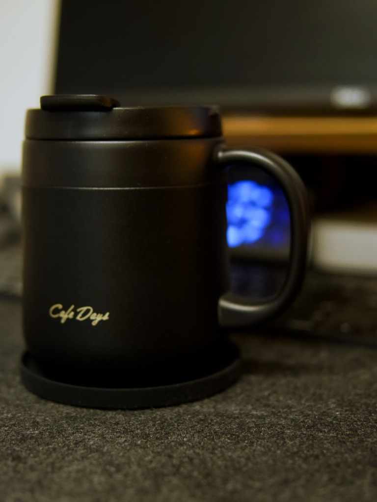 アイリスオーヤマの真空断熱カップを置いてみました。黒×黒。