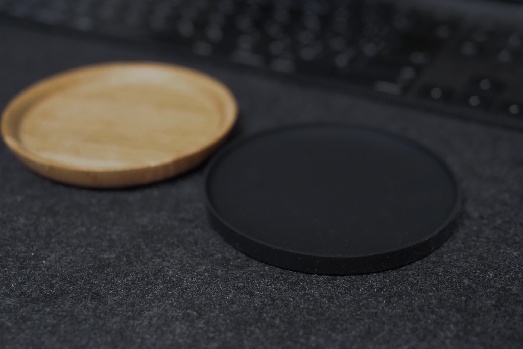 シンプルで実用性も高いこのコースターなのですが、一点デメリットを挙げるなら「ウール素材のデスクマットの上だと滑りやすい」ということです。